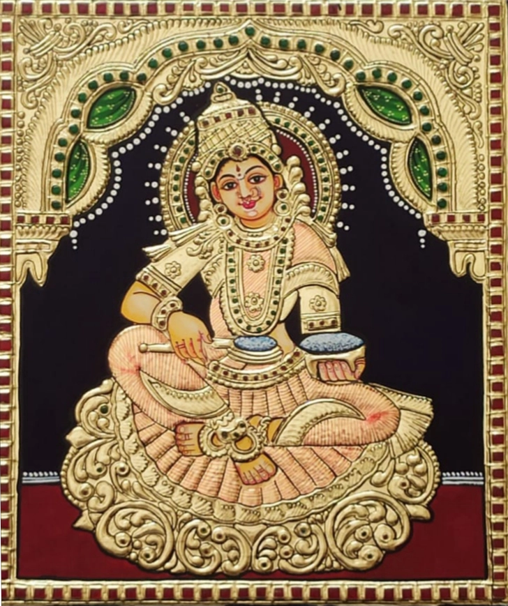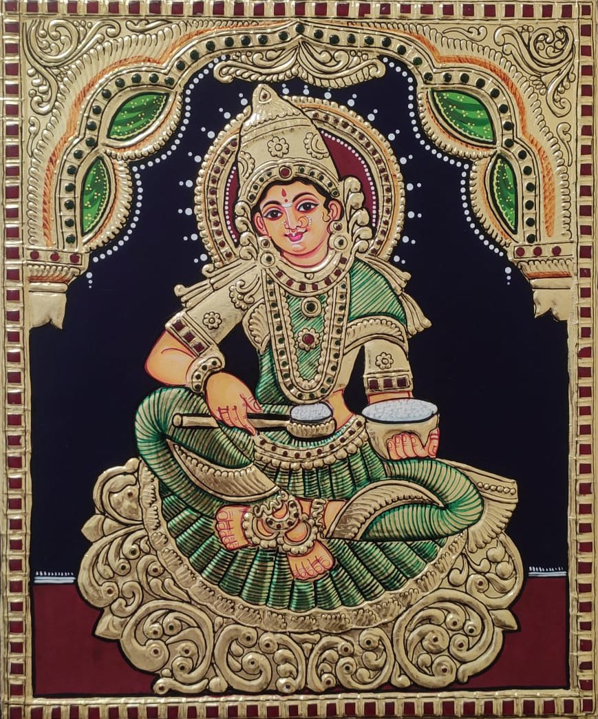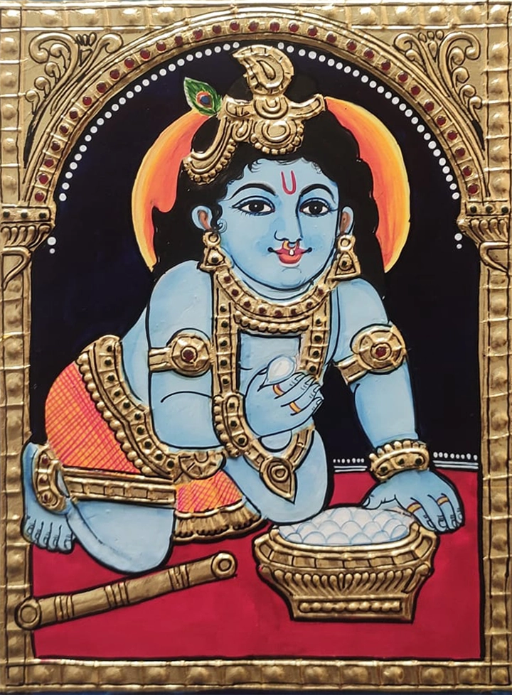 Tanjore painting, a classical South Indian art form known for its vibrant colors, surface richness, and compact composition, holds a special place in Bharani’s heart. Every stroke of her brush reflects a commitment to preserving this art while embracing new perspectives. Her work often includes intricate gold leaf work and the depiction of divine figures, mythological themes, and nature, all rendered with meticulous attention to detail .